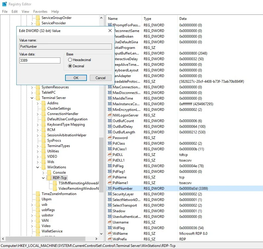 HKEY_LOCAL_MACHINE\System\CurrentControlSet\Control\Terminal Server\WinStations\RDP-Tcp\PortNumber